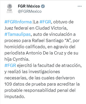 La Fiscalía General de la República (FGR), obtuvo este día, del Juez de Control Federal en Ciudad Victoria, Tamaulipas, auto de vinculación a proceso del imputado Rafael Santiago “A”, por homicidio calificado, premeditación, alevosía y ventaja, en agravio del periodista Antonio De la Cruz y de su hija Cynthia, que fueron privados de la vida.