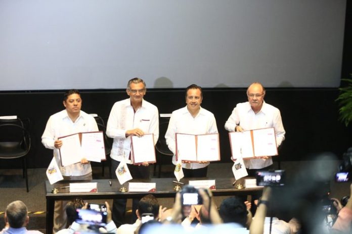 Durante el evento en el Museo Tamux, de esta capital, los tres gobernadores y el representante de Nuevo León, sostuvieron una reunión acompañados de los secretarios de Seguridad Pública de sus respectivos estados y posteriormente firmaron el Convenio de Colaboración que establece las bases para ser más eficaces en la responsabilidad de proteger la legalidad, brindar protección a las personas y su patrimonio, para defender las libertades, conseguir la paz tan anhelada y restaurar un modelo de convivencia más justo e inclusivo, donde la seguridad sea la base para un desarrollo más equilibrado y equitativo.