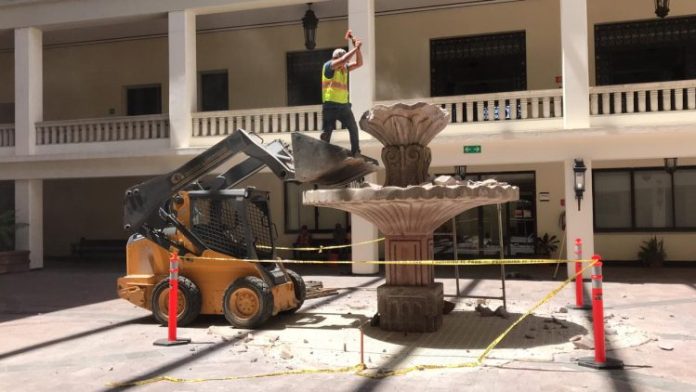 CIUDAD VICTORIA.- Desde este fin de semana la fuente que se encuentra en el patio central de Palacio de Gobierno está siendo removida del lugar por un grupo de trabajadores.