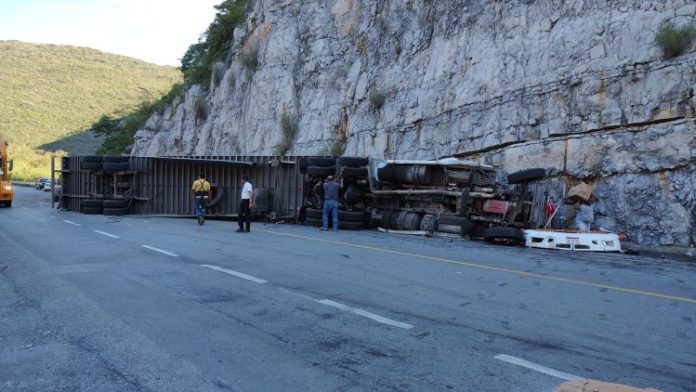 Aparentemente el exceso de velocidad y una dormitada provocó que el chofer perdiera el control y volcara sobre la superficie de rodamiento quedando atravesado sobre los carriles de circulación.