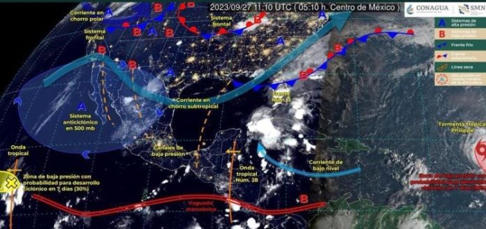 El Servicio Meteorológico Nacional señaló que durante este día, la onda tropical número 28 ingresará al oriente de la Península de Yucatán e interaccionará con un canal de baja presión que se extiende desde el Golfo de México hasta el sureste del país, y aunado al ingreso de humedad proveniente del Golfo de México y Mar Caribe, propiciarán lluvias puntuales muy fuertes en Quintana Roo, Yucatán y Chiapas, lluvias puntuales fuertes en Campeche y Oaxaca, y chubascos en Tabasco y Veracruz.