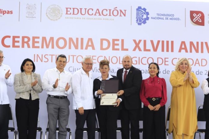Al encabezar la ceremonia cívica de honores, en el marco del 48 aniversario de la fundación del Tecnológico de Ciudad Victoria, el secretario general de Gobierno, junto al director general del Tecnológico Nacional de México, Ramón Jiménez López, develó una placa con la que a partir de hoy se denomina Avenida Tecnológico, a la vialidad ubicada frente al plantel y además entregó reconocimientos a tres maestros con más de 40 años de servicio en la institución: Yolanda Dávila López, Wilfrido Ponce De la Fuente y Renato Romo Ramírez.