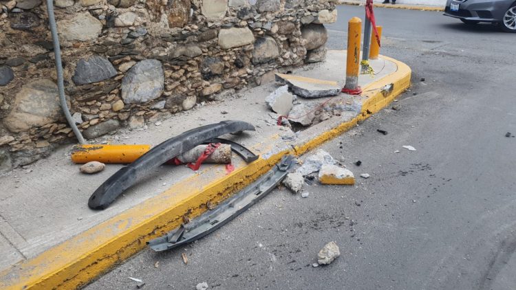 Tras el impacto el conductor de la camioneta perdió el control y se estrelló contra la barda de piedra.