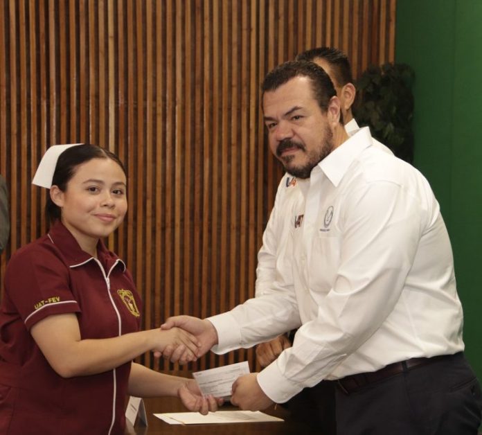 El rector de la Universidad Autónoma de Tamaulipas (UAT), C.P. Guillermo Mendoza Cavazos, presidió la ceremonia de entrega de estímulos económicos a estudiantes hijos del personal académico, que se distinguieron por su alto promedio durante el período escolar 2023-1 de esta casa de estudios.
