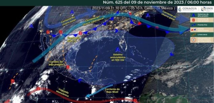 Por su parte, el Servicio Meteorológico Nacional informó que este día, el frente frío número nueve recorrerá el norte de la República Mexicana e interaccionará con la corriente en chorro subtropical en niveles altos de la atmósfera y en superficie con un canal de baja presión sobre el noreste del país, lo cual producirá lluvias puntuales muy fuertes en Coahuila, Nuevo León y Tamaulipas; fuertes en Chihuahua y Durango, así como chubascos en Zacatecas y San Luis Potosí.