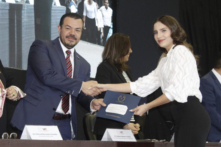 Acompañado por la Dra. Cinthya Patricia Ibarra González, secretaria de Gestión Escolar de la UAT, el C.P. Guillermo Mendoza felicitó al alumnado por el esfuerzo sobresaliente que les ha permitido recibir esta distinción.