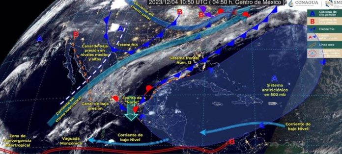 La masa de aire frío asociada mantendrá evento de “Norte” con rachas de viento de 70 a 90 kilómetros por hora en el Istmo de Tehuantepec, con oleaje de dos a cuatro metros de altura en el Golfo de Tehuantepec; y con rachas de 50 a 70 kilómetros por hora y oleaje de uno a dos metros en el litoral de Veracruz.
