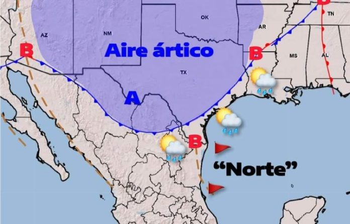 Posteriormente se espera cielo medio nublado a soleado, evento «Norte» con ráfagas de viento entre los 55 a 75 kilómetros por hora y velocidades de cien a 120 kilómetros por hora en el Golfo de México y notorio descenso térmico.