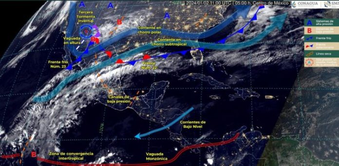 El Servicio Meteorológico Nacional señaló que la tercera tormenta invernal continuará su desplazamiento dirigiéndose hacia el sureste de Estados Unidos, dejando de afectar al territorio mexicano al finalizar el día.