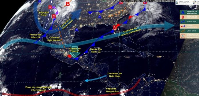 Por otra parte, el frente frío número 24 se desplazará sobre el noroeste y norte de la República Mexicana, en interacción con una vaguada polar y con las corrientes en chorro polar y subtropical, generando rachas de viento fuertes, marcado descenso de temperatura en ambas regiones, así como chubascos en Sonora y Chihuahua.