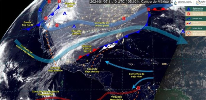 Por otra parte, el sistema frontal número 24 con características de estacionario se extenderá en el oriente y sur del Golfo de México, y en interacción con un canal de baja presión sobre la Península de Yucatán, originará lluvias y chubascos en San Luis Potosí, Hidalgo, Puebla, Veracruz, Tabasco y entidades de la Península de Yucatán, así como lluvias aisladas en Tamaulipas.