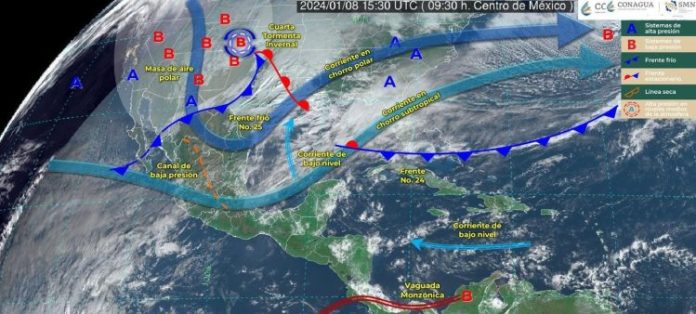 El Servicio Meteorológico Nacional informó esta tarde de lunes, que el frente frío número 25 recorrerá el norte y noreste de la República Mexicana, mientras que la cuarta tormenta invernal se desplazará sobre el centro de Estados Unidos.