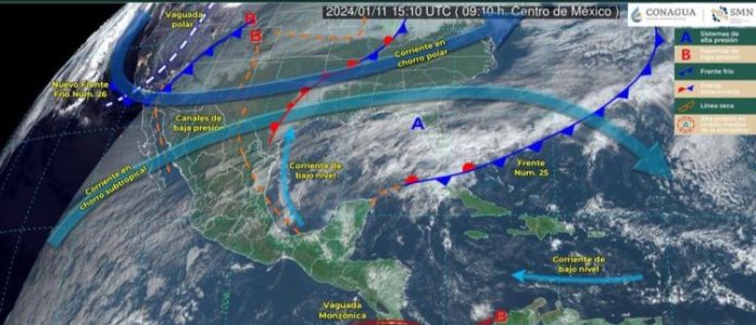 Para la zona sur del estado durante el mediodía del viernes el frente frío número 26 ingresará a la zona con baja probabilidad de lluvias, viento del componente nor-noreste y ráfagas de 55 a 75 kilómetros por hora.