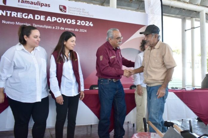 Nuevo Morelos, Tamaulipas.- La Secretaría de Desarrollo Rural, Pesca y Acuacultura en coordinación con el Sistema DIF Estatal y la Delegación de Programas Federales para el Bienestar Social en Tamaulipas, realizó la entrega de apoyos del Programa de Fomento a la Producción Rural que consiste en paquetes de granjas de aves de postura y huertos de traspatio, en el municipio de Nuevo Morelos, Tamaulipas.