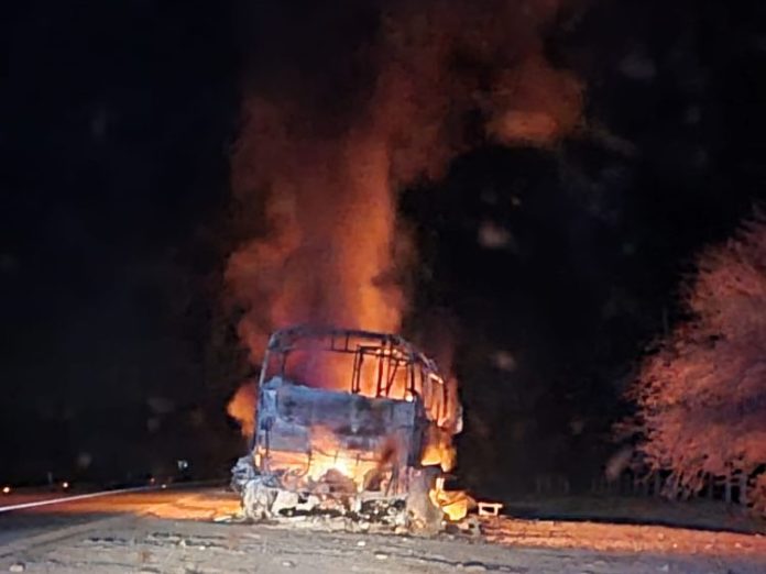 González, Tamaulipas.- Personal de la Guardia Estatal de Apoyo Carretero comisionado a la Estación Segura Escandón, acudió al tramo Llera-González para brindar auxilio ante el incendio de un autobús de dos pisos suscitado en el kilómetro 19 de la Carretera Federal 81.