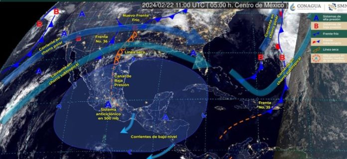 A su vez, la aproximación e ingreso de un nuevo frente frío, sobre la frontera norte de México y su interacción con un canal de baja presión sobre Tamaulipas, en combinación con una línea seca sobre el norte de Coahuila, y con la corriente en chorro subtropical, ocasionarán rachas de viento de 50 a 70 kilómetros por hora en el norte y noreste del país.