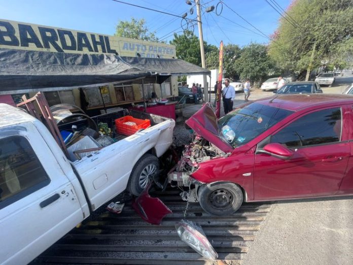 Por esquivar a la mujer el conductor del automóvil Chevrolet desvió su trayectoria hacia su lado derecho y se impactó contra la caja de una camioneta marca Ford Ranger propiedad de un negocio de venta de carnitas.
