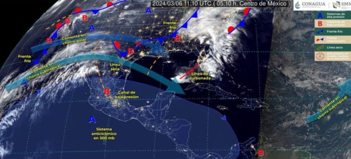 En tanto que, un canal de baja presión extendido sobre el oriente del país en interacción con una línea seca al norte de Tamaulipas y el flujo de la corriente en chorro subtropical, mantendrán fuertes rachas de viento con posibles tolvaneras, así como lluvias aisladas en el noreste de México.
