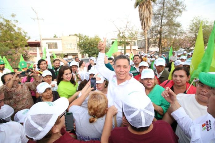 El candidato del Partido Verde al Senado de la República, Eugenio Hernández fue recibido con batucada y la “V” de la Victoria por los vecinos de la Ampliación Libertad en Ciudad Victoria.