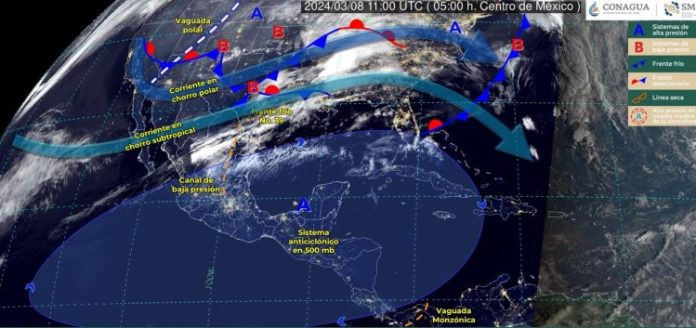 También persistirán las condiciones para la caída de aguanieve en las primeras horas de este día en zonas altas de Sonora y Chihuahua; rachas de viento de hasta 90 kilómetros por hora en Chihuahua y Durango; así como viento de componente norte de hasta 80 kilómetros por hora y tolvaneras en estados del norte y noreste del país.
