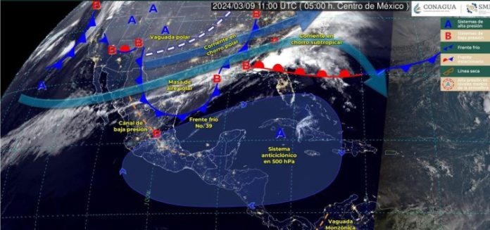 El SMN de la Conagua señaló que el frente frío número 39 recorrerá el oriente y sureste del territorio mexicano, interaccionará con un canal de baja presión sobre el sureste del país, propiciando lluvias puntuales fuertes en zonas de Puebla, Veracruz y Oaxaca.
