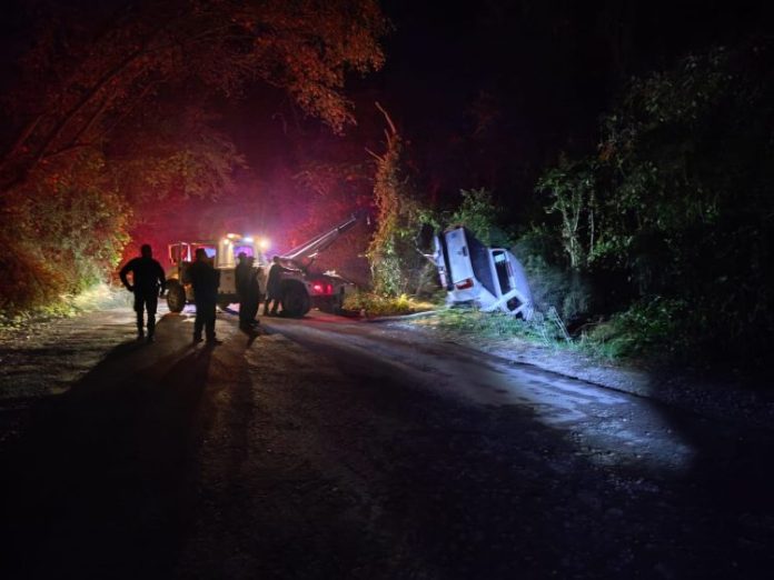 Ocampo, Tamaulipas.- Una camioneta perteneciente a la empresa Transpais se volcó esta madrugada al circular sobre el kilómetro 24 de la Carretera Estatal 66 en el tramo Tula-Ocampo.