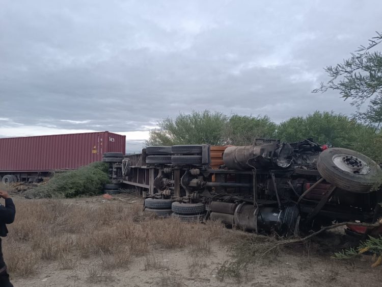 Tras el trágico accidente el tractocamión que transportaba dos contenedores quedó volcado sobre uno de sus costados fuera de la cinta asfáltica, sin embargo, el operador no fue encontrado en el área, por lo que se presume que huyó entre la maleza.