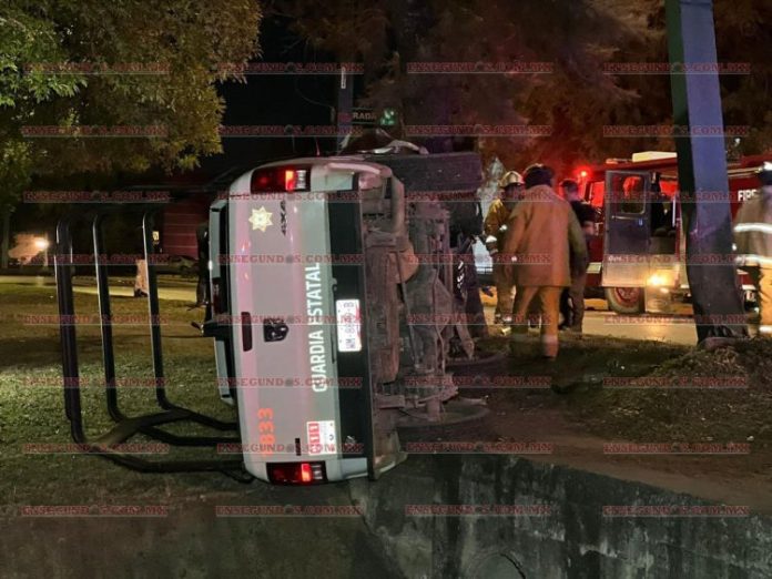 El choque contra objeto fijo que terminó en volcadura ocurrió alrededor de las 5:00 horas de hoy viernes cuando la patrulla 1833 de la Guardia Estatal circulaba por el bulevar Fidel Velázquez en sentido de norte a sur.
