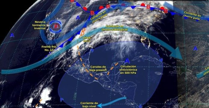 Por otra parte, la corriente en chorro subtropical y el frente frío número 43 interaccionarán con una línea seca y con aire cálido y húmedo del Golfo de México, sobre el noreste del país, generando lluvias aisladas en Coahuila, Nuevo León y Tamaulipas; vientos muy fuertes a intensos con rachas de cien a 120 kilómetros por hora y posible formación de torbellinos en Coahuila, rachas de viento de 70 a 80 kilómetros por hora en Nuevo León, Tamaulipas y San Luis Potosí; además de viento de componente sur (surada) con rachas de 60 a 80 kilómetros por hora en Veracruz y Oaxaca; y de 40 a 60 kilómetros por hora en Chiapas, Campeche, Yucatán y Quintana Roo.