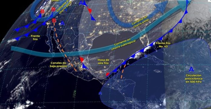 Este día, el frente frío número 43 recorrerá la Península de Yucatán hacia el Mar Caribe e interaccionará con un canal de baja presión que se extenderá sobre el sureste mexicano.