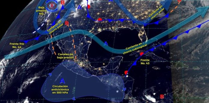 Este día, el frente frío número 44 se desplazará sobre el noroeste de México, asociado con una vaguada polar y con la corriente en chorro polar, ocasionará chubascos y lluvias puntuales fuertes en Baja California, y posible caída de nieve o aguanieve en las sierras de esta entidad, además de lluvias aisladas en Sonora.