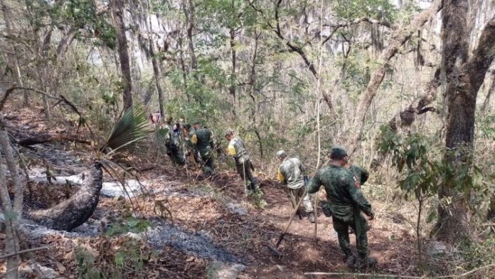 En el combate al incendio forestal se encuentran desplegados en el lugar 45 efectivos y seis vehículos del Ejército Mexicano, así como 22 agentes y