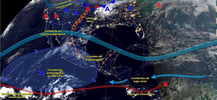 Por otra parte, canales de baja presión en el oriente y sureste de la República Mexicana, en combinación con el ingreso de humedad del Océano Pacífico, Golfo de México y Mar Caribe, originarán lluvias y chubascos vespertinos acompañados con descargas eléctricas en dichas regiones, presentándose lluvias puntuales fuertes en Oaxaca y Chiapas.