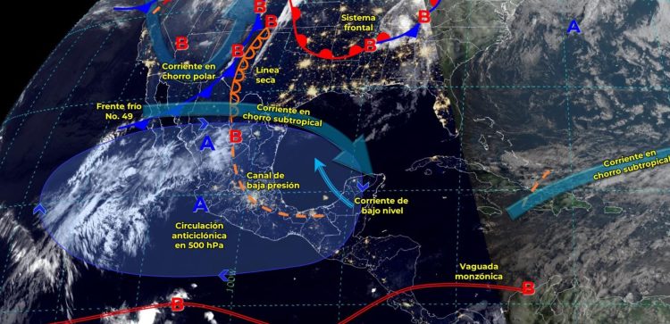 Por otra parte, una línea seca se extenderá sobre el norte del territorio nacional, en interacción con la corriente en chorro subtropical, producirá lluvias aisladas y vientos fuertes con tolvaneras en el noreste de México.