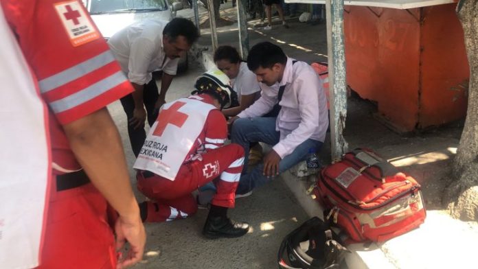 Paramédicos de Cruz Roja atendieron a un conductor de una motocicleta que terminó chocando con un vehículo en el cruce del 27 Morelos.