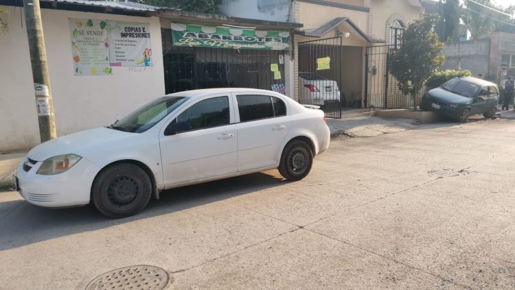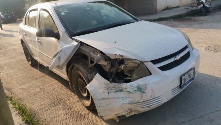 La conductora de un automóvil que desvió su trayectoria terminó golpeando un Chevy que estaba estacionado dejándolo prácticamente sobre la banqueta.