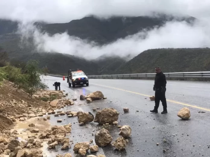 Jaumave, Tamaulipas.- En coordinación con elementos de Tránsito Municipal de Jaumave, personal de la Guardia Estatal retiró piedras de la cinta asfáltica que cayeron de la sierra y obstaculizaban el paso por la Carretera Rumbo Nuevo.