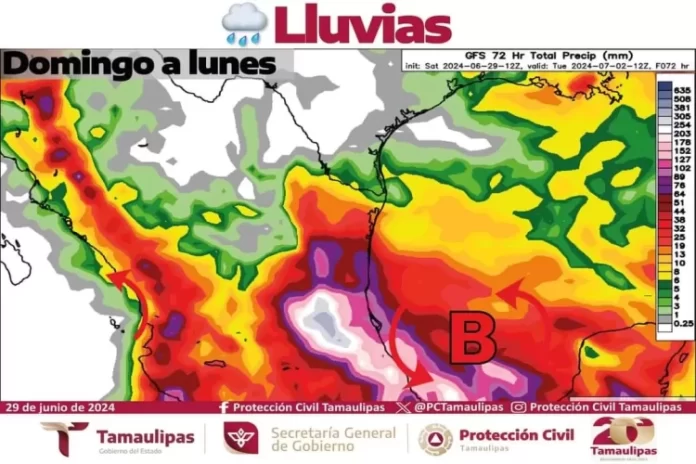 Protección Civil Tamaulipas informó que se esperan acumulados puntuales de precipitación para la zona norte de 30 a 50 milímetros.