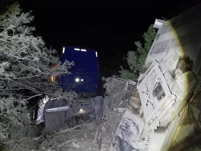 Tula, Tamaulipas.- Al realizar recorridos de seguridad y vigilancia sobre la Carretera Federal 101 personal de la Guardia Estatal de Apoyo Carretero atendió la madrugada de este viernes una volcadura de tractocamión ocurrida en el kilómetro 30 sobre el tramo Tula-San Luis Potosí.