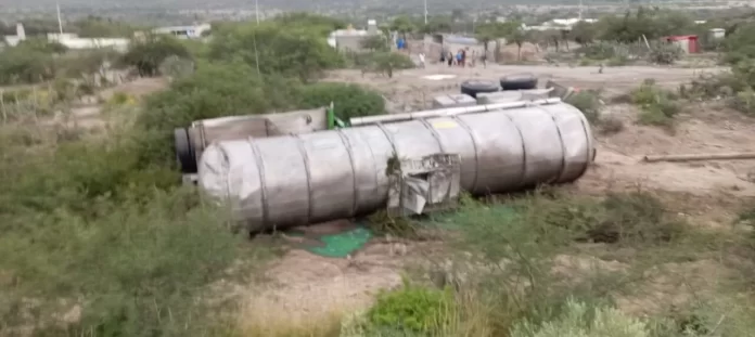Tula, Tamaulipas.- Personal de la Guardia Estatal de Apoyo Carretero comisionado a la Estación Segura Tula atendió un reporte del Centro de Control, Comando, Comunicación y Cómputo (C5) de una pipa volcada en el kilómetro 59 de la carretera federal 101 a la altura del tramo Tula-Ciudad Victoria, en el Ejido Álvaro Obregón.