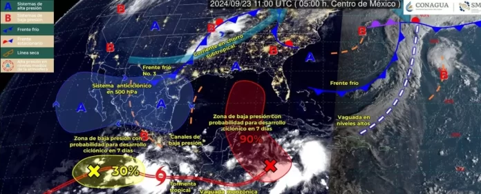 Por su parte, una zona de baja presión con alta probabilidad de desarrollo ciclónico (o posible ciclón tropical) se localizará sobre el noroeste del mar Caribe y generará lluvias puntuales intensas y vientos con rachas de 40 a 60 kilómetros por hora en Campeche, Yucatán y Quintana Roo.