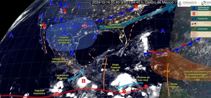 Por otro lado, la onda tropical número 26 se desplazará sobre la Península de Yucatán e interaccionará con la humedad del Golfo de México, propiciando lluvias de fuertes a muy fuertes en zonas del oriente y sureste mexicano, previéndose lluvias puntuales intensas en Campeche, Yucatán y Quintana Roo, estas lluvias estarán acompañadas de descargas eléctricas, rachas de viento y posible caída de granizo, asimismo podrían incrementar los niveles de ríos y arroyos, deslaves e inundaciones en zonas bajas de los estados mencionados.