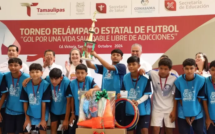 Ciudad Victoria, Tamaulipas.- Para fomentar la salud corporal y fortalecer la salud mental, el secretario de Salud, Vicente Joel Hernández Navarro, realizó la premiación y clausura del primer torneo relámpago estatal de fútbol, varonil y femenil, “Gol por una vida saludable libre de adicciones”.