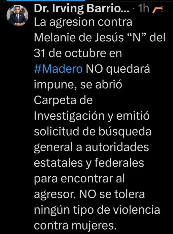 “La agresión contra Melanie de Jesús ”N” del 31 de octubre en #Madero NO quedará impune”, refirió a través de una publicación en su cuenta oficial de redes sociales.