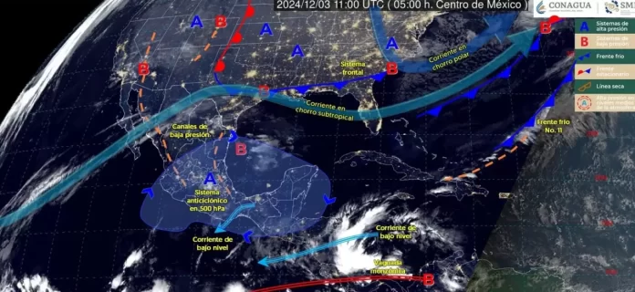 Finalmente, la circulación anticiclónica en niveles medios de la atmósfera mantendrá tiempo estable y sin lluvia; además de ambiente frío por la mañana y noche sobre el noroeste, norte, occidente, centro y sur de la República Mexicana.