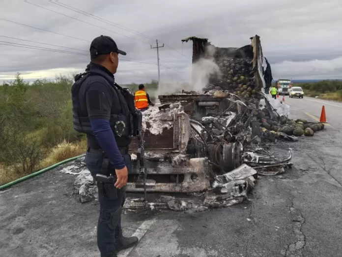 Debido a la incineración, no fue posible identificar las características de la unidad, sin embargo, se tiene conocimiento de que transportaba sandía en las cajas de ambos remolques.