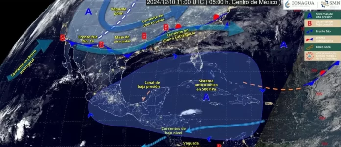 Finalmente, una circulación anticiclónica en niveles medios de la atmósfera, generará ambiente cálido durante la tarde en zonas del noroeste, noreste, centro y oriente del país, sur del litoral del Golfo de México y oriente de la península de Yucatán; y caluroso en zonas de Nayarit, Jalisco, Colima, Michoacán, Guerrero, Oaxaca, Chiapas, Campeche y Yucatán.
