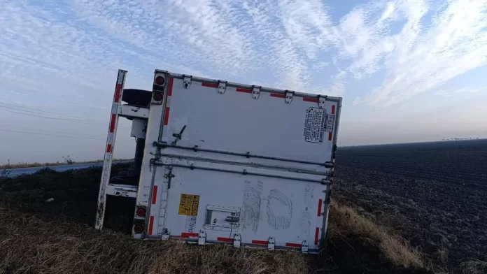 San Fernando, Tamaulipas.- Personal de la Guardia Estatal de Apoyo Carretero comisionado a la Estación Segura González Villarreal acudió al kilómetro 248 de la Carretera Federal 101 Victoria-Matamoros tras visualizar un tractocamión volcado sobre el carril de baja velocidad en el sentido sur-norte.