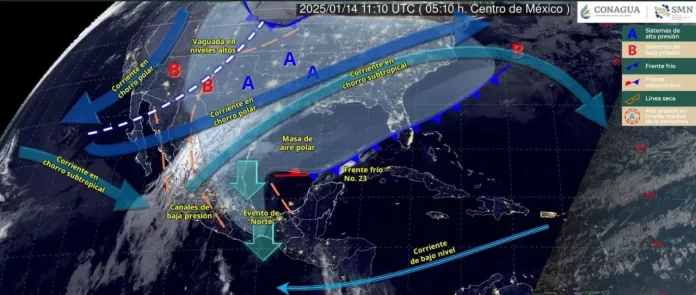 CIUDAD VICTORIA. – Durante este día, el frente número 23 se extenderá con características de estacionario desde el norte de la Península de Yucatán hasta el sur del Golfo de México; aunado a la entrada de humedad hacia el sureste del país, generando condiciones para lluvias fuertes a puntuales muy fuertes en dichas regiones.