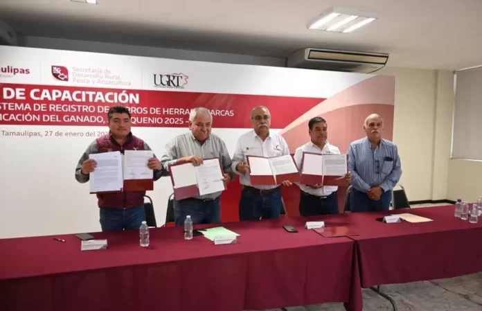 Ciudad Victoria, Tamaulipas.- Con la finalidad de revalidar su registro de fierro y marcas de identificación de ganado, la Secretaría de Desarrollo Rural, Pesca y Acuacultura y la Unión Ganadera Regional de Tamaulipas llevaron a cabo la firma del convenio de colaboración para dar inicio a la revalidación de registros de fierros y marcas de identificación del ganado, quinquenio 2025 – 2029.